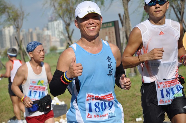 出了河濱道,傑生早就飛出去了,我跟國鈞的實力較接近,一直拖住他,一開始不要衝太快,就這樣一路聊聊、前半程刻意壓速度,以2:04跑完,狀況不錯。其實今天一起跑就覺得狀況不錯,最近練鐵人基礎耐力大有進步,加上事先心理建設作的不錯,所以跑起來毫無壓力。過了半程後,之前的耐心開始獲得回報,速度依然控制的不錯,原本被無數人碾過,現在已經沒人可碾過我們了,過了30K後,狀況有點不好,輕微撞牆現象,33-34K比較嚴重,配速大概掉到6:20左右,不過到35K,狀況開始變的很好,速度建立起來,比前半程都要快。